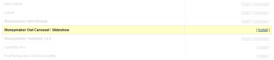 Когда Opencart установит модуль управления шаблоном, нажмите Изменить в той же строке, и вы попадете в панель управления шаблоном Moneymaker. Поздравляю! :) Вы установили модуль управления шаблоном и теперь самое время его настроить, но перед этим не забудьте в настройках самого магазина сменить шаблон с дефолтного на Moneymaker.