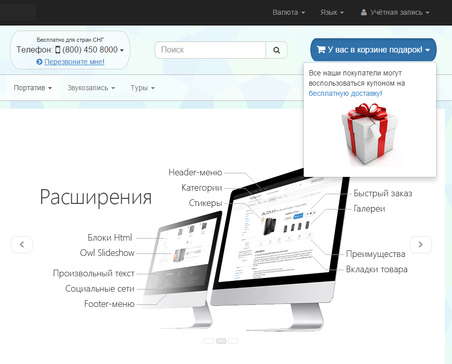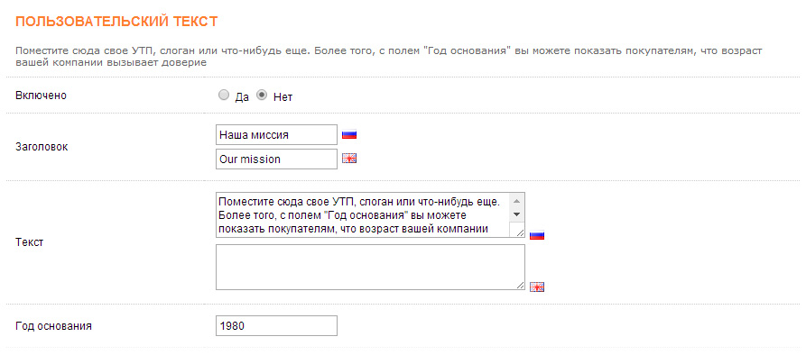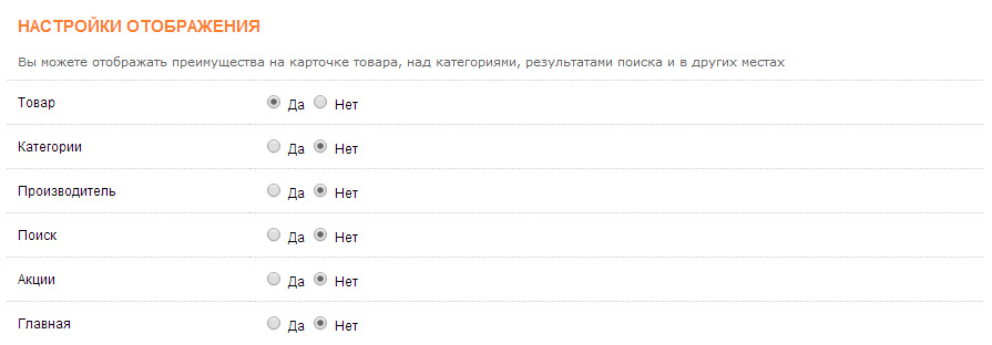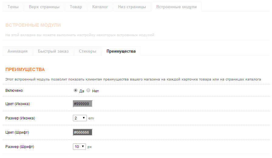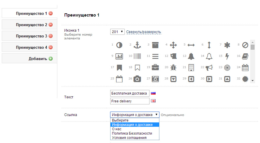 - Модуль Преимущества, который является одним из наиболее важных (и недооцененных, увы) модулей в любом магазине