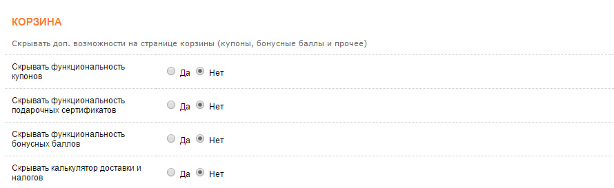 - Возможность отключения доп. функциональности корзины (купоны, бонусные баллы и т.д.)