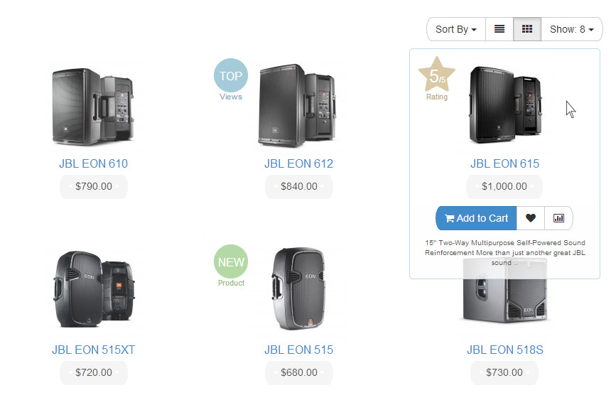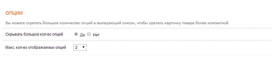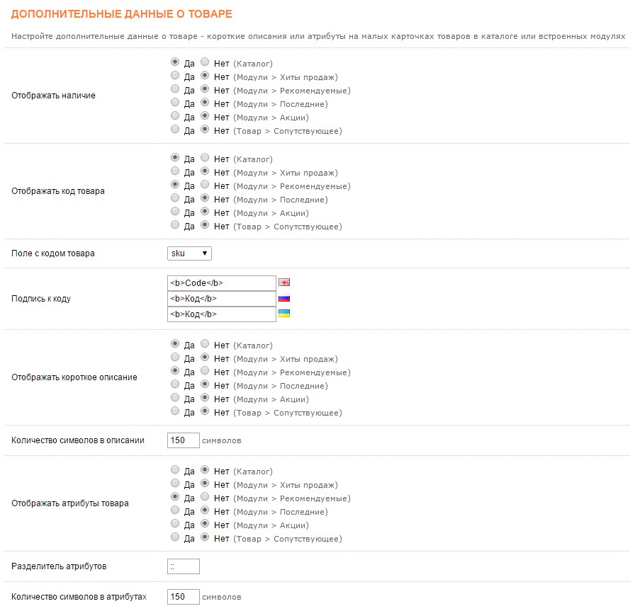Здесь можно настроить вывод дополнительной информации (краткого описания, атрибутов, наличия и артикула) в карточках товаров на страницах каталога (т.е. в категориях, поиске, акционных товарах, на странице товаров производителя и в закладках) или в базовых модулях, например выводить атрибуты и наличие, скрыв ненужные краткие описания товаров: