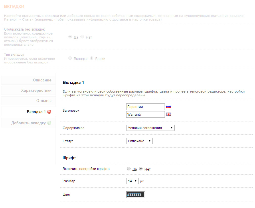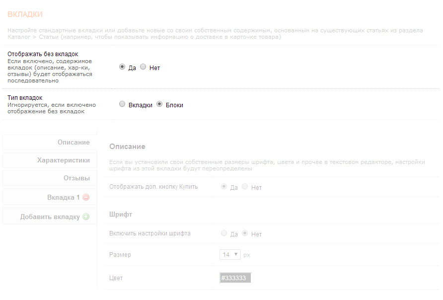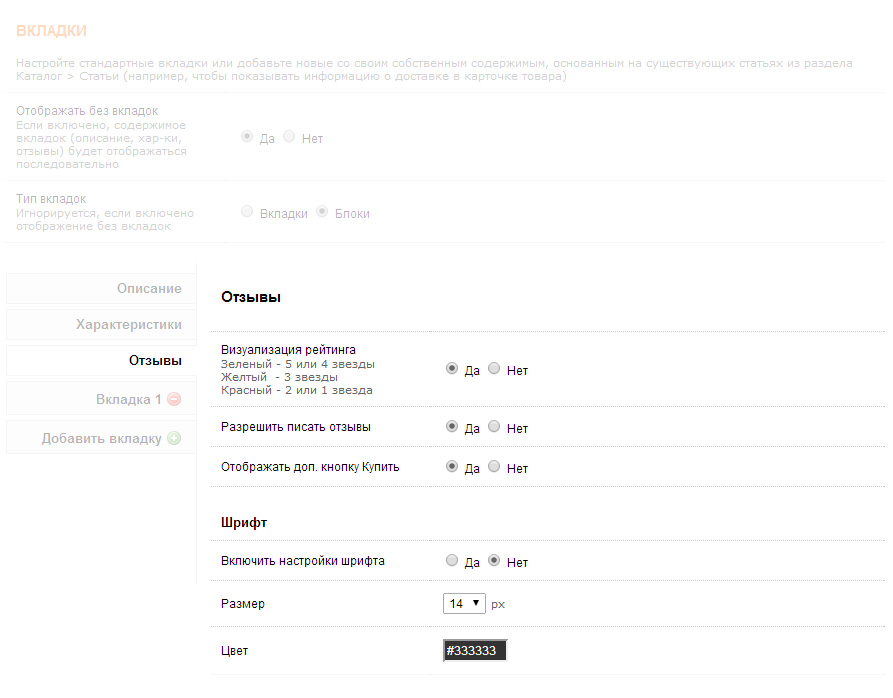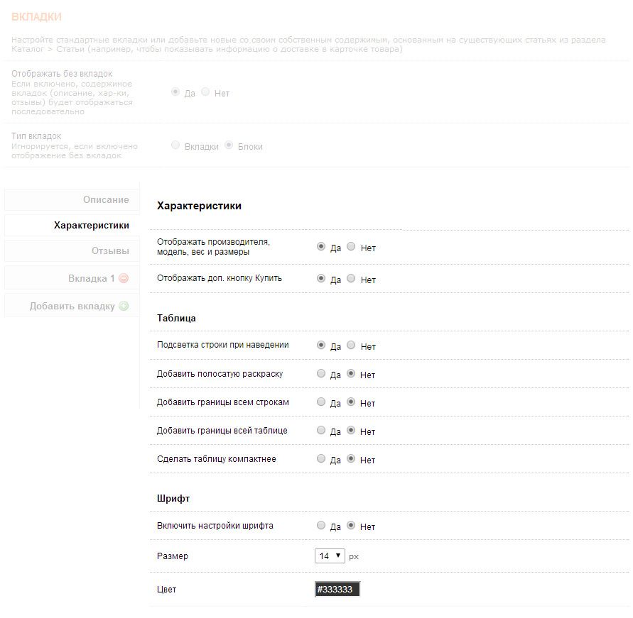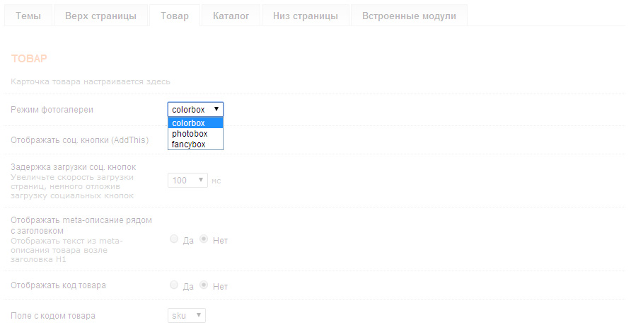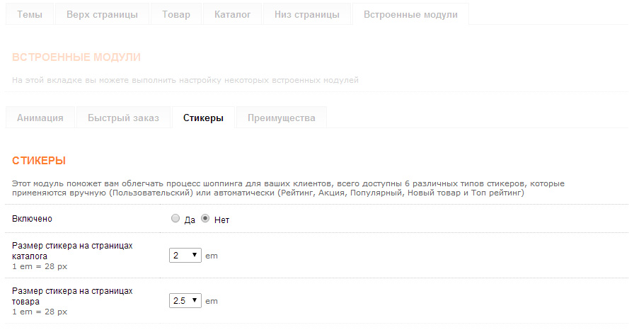 На данной вкладке модуля управления шаблоном находятся общие настройки, влияющие как на страницы товара, так и на страницы каталога, верх, низ и другие секции OpenCart.