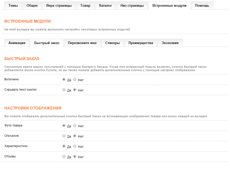 Здесь находятся общие настройки, связанные с наличием товаров. Среди них можно воспользоваться функцией отключения возможности покупки товаров при их нулевом количестве (кнопка Купить будет неактивна у таких товаров, соответственно скроется и кнопка встроенного модуля Быстрого Заказа):