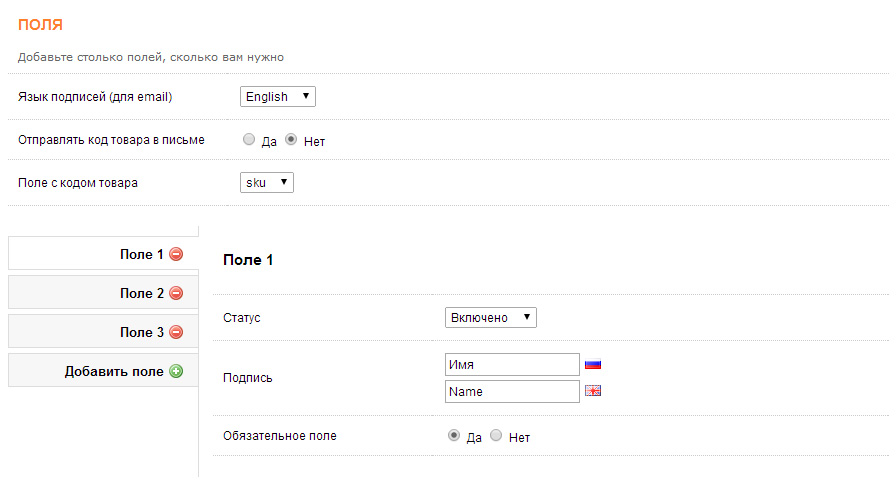 Для вывода кода товара можно указать требуемое поле из базы, в котором вы его храните, а также текстовую подпись к этому коду (она будет отображаться и в каталоге, и в карточке товара).