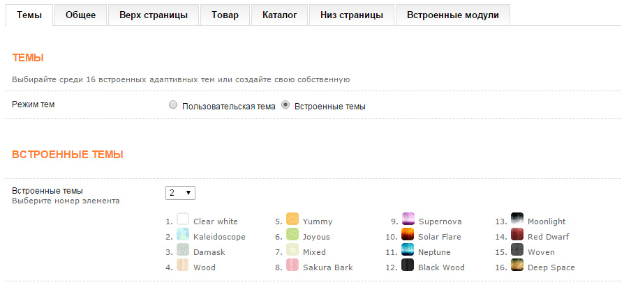 - Встроенные темы доступны сразу после установки (16 готовых к использованию адаптивных тем)
