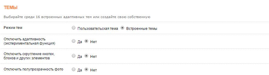 Здесь вы можете изменить способ использования тем, а также некоторые элементы оформления, в частности можно полностью отключить адаптивность шаблона (он перестанет подстраиваться под мобильные устройства и будет работать постоянно в режиме просмотра с обычного десктопа). Также в этом блоке настроек можно отключить скругление углов кнопок, полей ввода и прочих элементов интерфейса, сделав шаблон "квадратным". Еще одна функция отсюда - отключение полупрозрачности фото, позволит вам сразу показывать полноцветные фото (по умолчанию они слегка прозрачные, и становятся полноцветными при наведении курсора мышки).